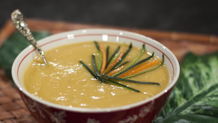 Return to saucepan and add water until desired consistency is reached. Add coconut milk, heat and serve.