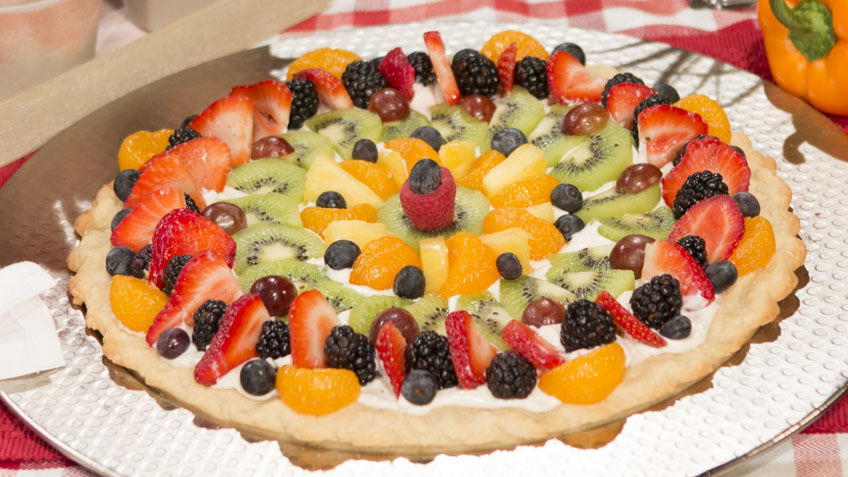When the cookie dough is cool, spread the cream cheese mixture on top and cover with your favorite fresh fruit. Chill in the refrigerator until ready to serve.