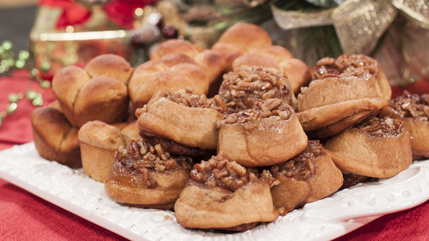 With a serrated knife, slice into 1 ½ inch slices. Place slices on top of pecans in the muffin tins. Repeat process with remaining dough.
