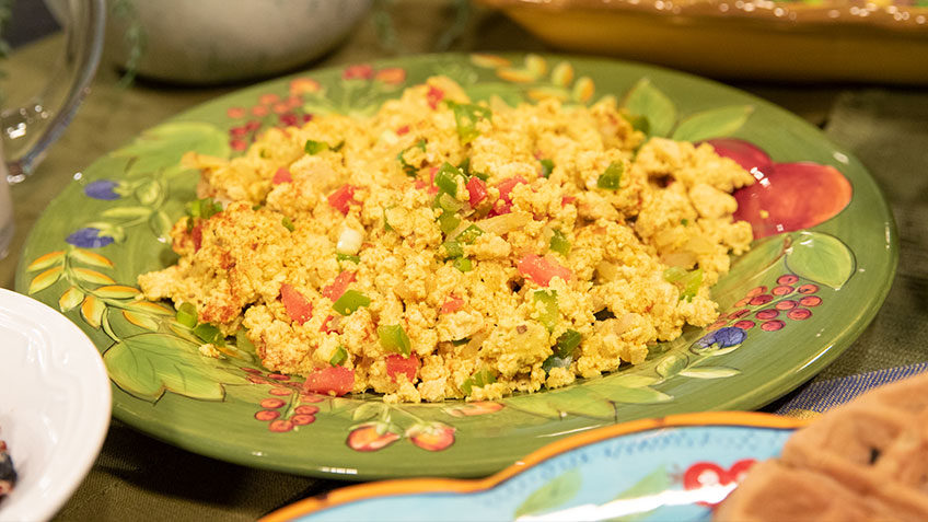 In a large mixing bowl, mash tofu into chunks with a fork or potato masher.